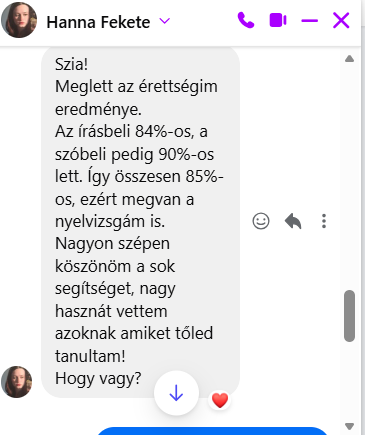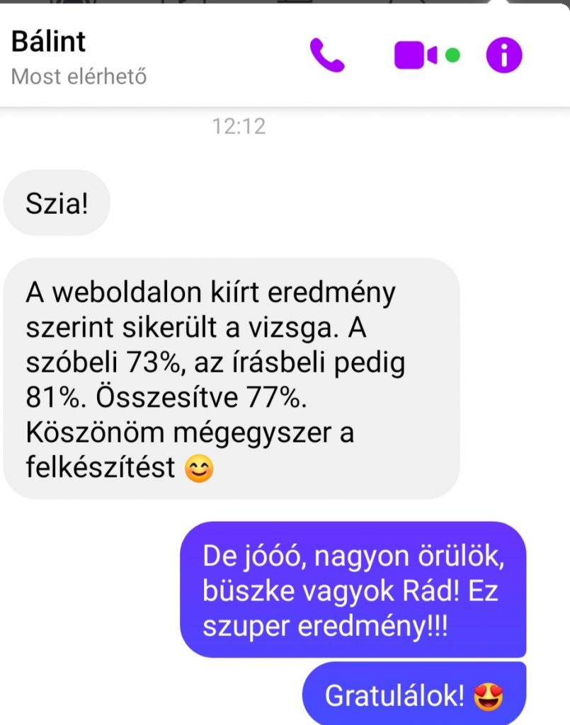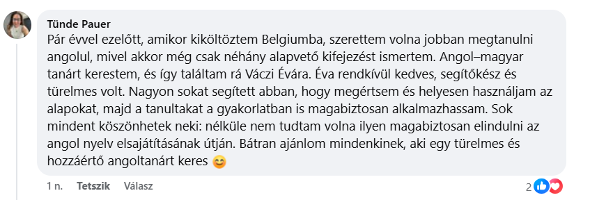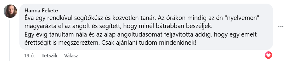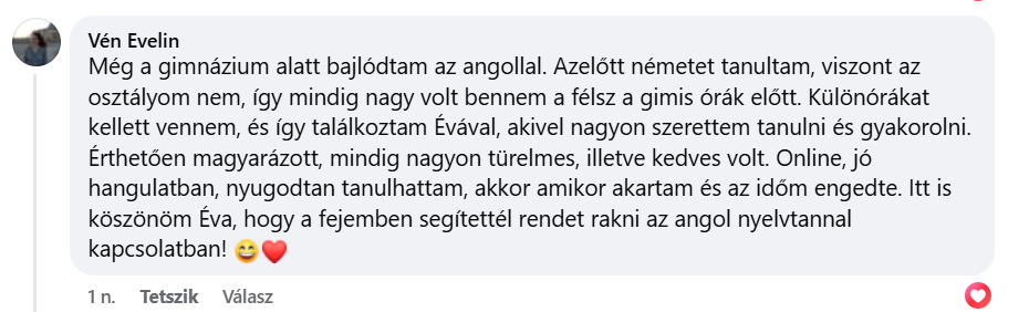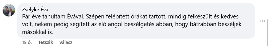 Többszöri nekifutással végre rátaláltam arra az angoltanárra, akivel közösen, könnyedén leküzdöm az angol nyelv okozta nehézségeket. A kérdéseimre, amik felmerülnek bennem a leckék során, mindig megkapom a logikus, érthető magyarázatot.